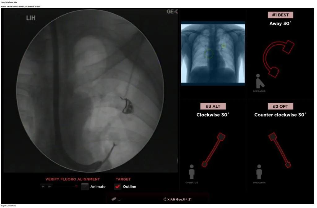 患者是一位59歲的男性,入院診斷左固有上葉前段肺小結(jié)節(jié),大小1.5cm*1.5cm。因為病灶與支氣管不相通,無法開展經(jīng)支氣管自然腔道的活檢,而且病變距離胸壁較遠(yuǎn)、肋骨阻隔進(jìn)針線路、病灶周圍有血管包繞,如果進(jìn)行CT引導(dǎo)下經(jīng)皮肺穿刺活檢,則存在較大的氣胸、出血等并發(fā)癥的風(fēng)險。