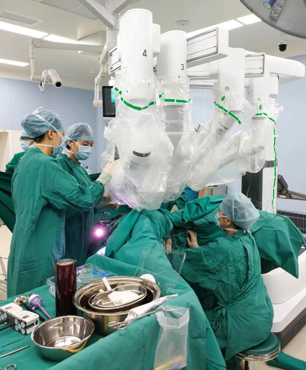 婦科腫瘤醫(yī)院院長(zhǎng)王海琳聚精會(huì)神地操控著達(dá)芬奇Xi(第四代)手術(shù)機(jī)器人,3只機(jī)械臂相互配合,通過(guò)肚臍“鉆”進(jìn)腹腔,嫻熟地將剝離出的患者子宮肌瘤和左側(cè)卵巢畸胎瘤放入標(biāo)本袋中,沿肚臍穿刺孔取出,至此,第四代達(dá)芬奇機(jī)器人在王海琳的操作下,成功完成陜西省單孔手術(shù)“首秀”。