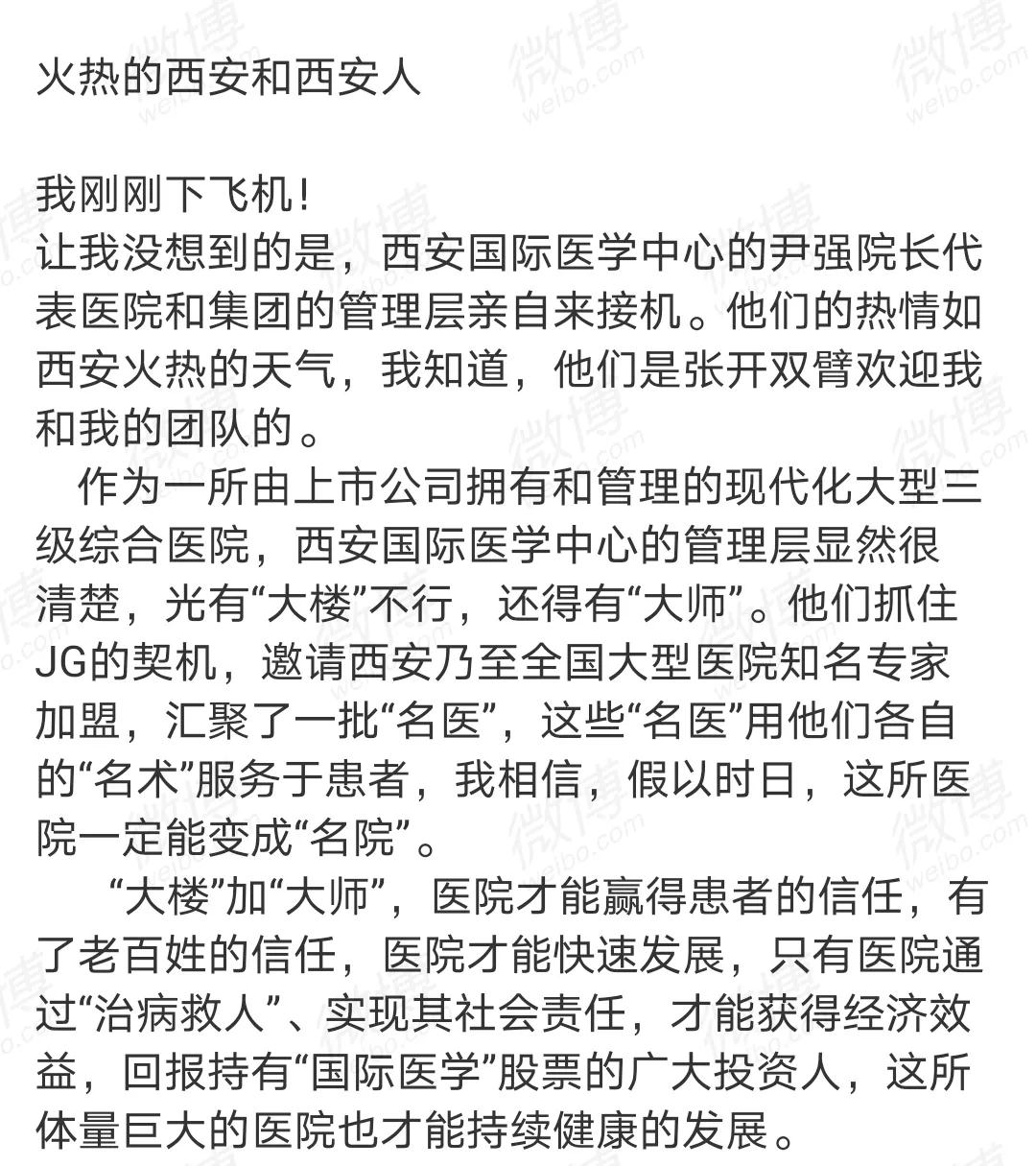 “讓我沒想到的是,西安國(guó)際醫(yī)學(xué)中心醫(yī)院的尹強(qiáng)院長(zhǎng)代表醫(yī)院和集團(tuán)的管理層親自來(lái)接機(jī),我知道,他們是張開雙臂歡迎我和我的團(tuán)隊(duì)的?!边@是郭樹忠教授加盟該院時(shí),在機(jī)場(chǎng)發(fā)布的一條微博。