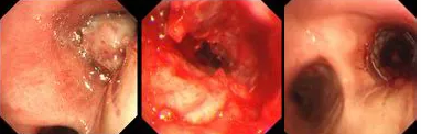 原來(lái),秦爺爺入院時(shí)診斷為“右主支氣管”鱗狀細(xì)胞癌伴壞死。他的右主支氣管被腫瘤完全堵塞,混合性狹窄。面罩吸氧10升/分的狀況下,指脈氧只有85%,無(wú)法平躺,呼吸困難,病情十分危急,隨時(shí)有生命危險(xiǎn)。