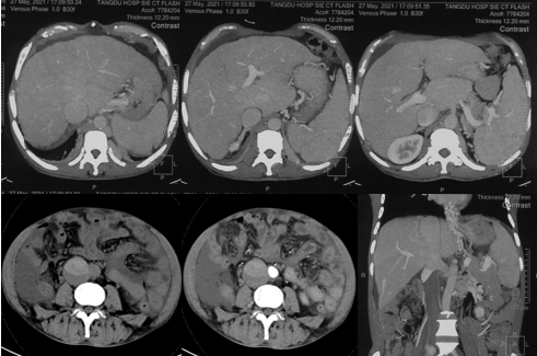 6月20日,患者及家屬懷揣著忐忑的心情來到西安國際醫(yī)學中心醫(yī)院找到韓國宏教授,韓教授詢問病情后閱患者外院CT片,明確診斷布加綜合征,同時發(fā)現(xiàn)了一個新的問題,在詢問病史時了解到患者近一周雙下肢乏力伴腫脹明顯加重,遂立即安排了急診CT,證實下腔靜脈內急性血栓形成!