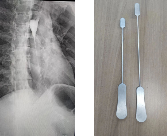 為了建立胸骨后的人工隧道,李小飛教授還自制了一把特殊的彎鉗,用于做胸骨后隧道便于將結(jié)腸順利從腹腔經(jīng)過(guò)胸骨后隧道提至頸部。