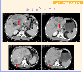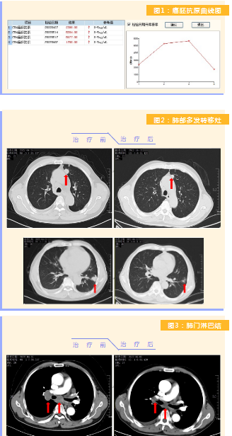 患者完成1周期治療后,上腹部疼痛癥狀基本消失,梗阻性黃疸癥狀緩解,腫瘤指標(biāo)下降(圖1),肺部多發(fā)轉(zhuǎn)移灶消失和縮?。▓D2),雙肺門淋巴結(jié)縮小(圖3),肝臟多發(fā)轉(zhuǎn)移灶縮小(圖4)。