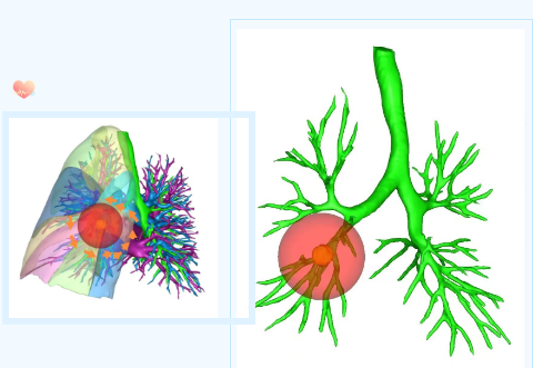 據(jù)王武平主任介紹,胸外科團(tuán)隊(duì)目前已常規(guī)開展不同部位肺小結(jié)節(jié)的聯(lián)合肺亞段切除術(shù),為肺小結(jié)節(jié)患者提供個體化的治療。術(shù)前進(jìn)行三維重建,以磨玻璃結(jié)節(jié)為中心,勾勒出病灶周圍2cm切緣球,規(guī)劃切除范圍和路徑,保證足夠切緣,實(shí)現(xiàn)肺結(jié)節(jié)的精準(zhǔn)切除和患者快速康復(fù),該技術(shù)既能實(shí)現(xiàn)肺結(jié)節(jié)的切除治愈,又能最大程度保留患者的肺功能,是目前針對早期肺磨玻璃結(jié)節(jié)肺癌較先進(jìn)的外科診療技術(shù)。
