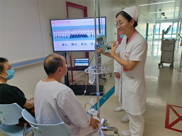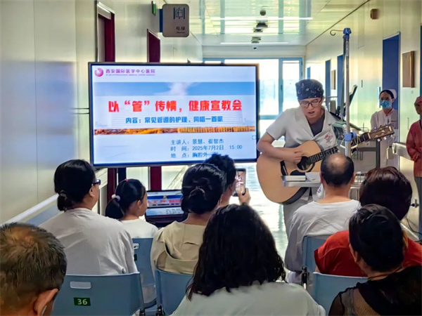 宣教會現(xiàn)場還充滿了溫暖的音符。崔智杰護(hù)士巧妙地將音樂療愈融入護(hù)理關(guān)懷,為在場患者深情彈唱了《隱形的翅膀》和《月亮代表我的心》。他表示:“醫(yī)護(hù)人員和家屬的心愿是一樣的,都期盼患者早日康復(fù)。希望音樂的感染力能為他們增添戰(zhàn)勝病魔的力量?!备杪暡粌H傳遞了關(guān)懷,也進(jìn)一步拉近了護(hù)患距離,增強(qiáng)了患者積極面對疾病的心理建設(shè)。
