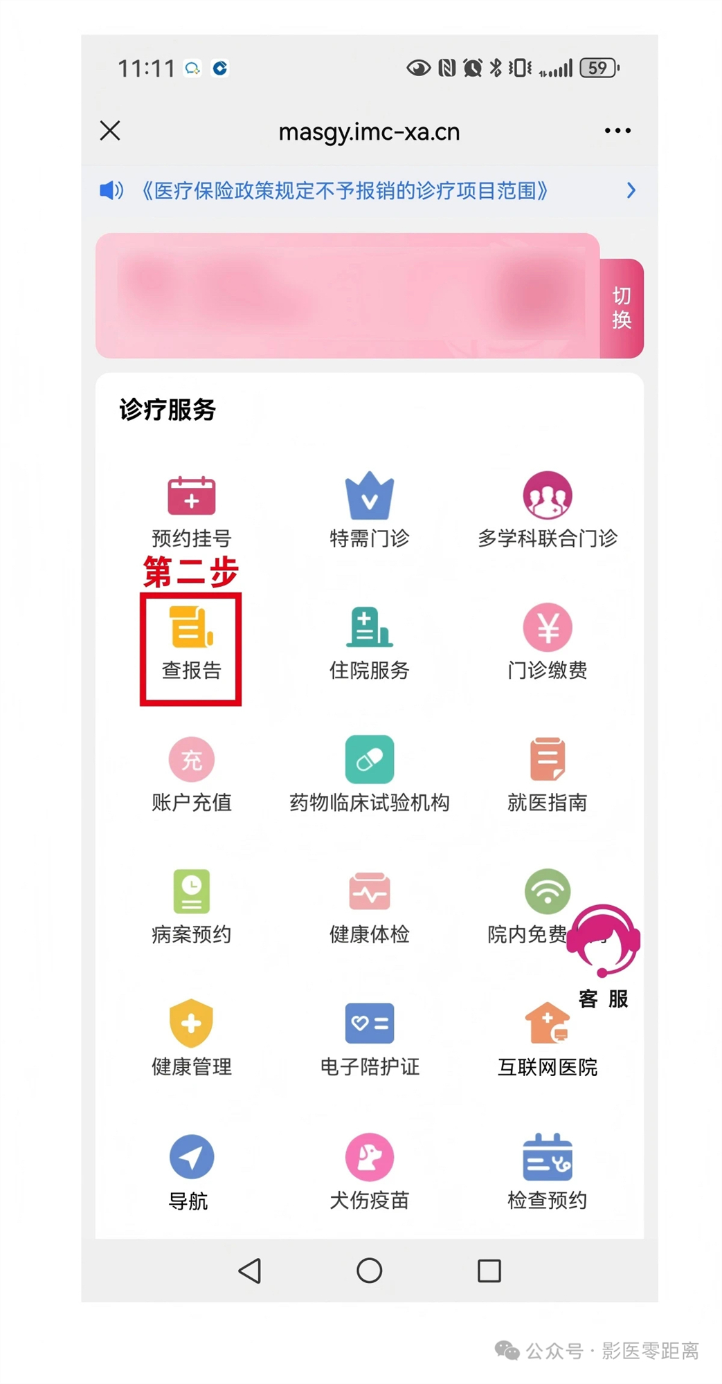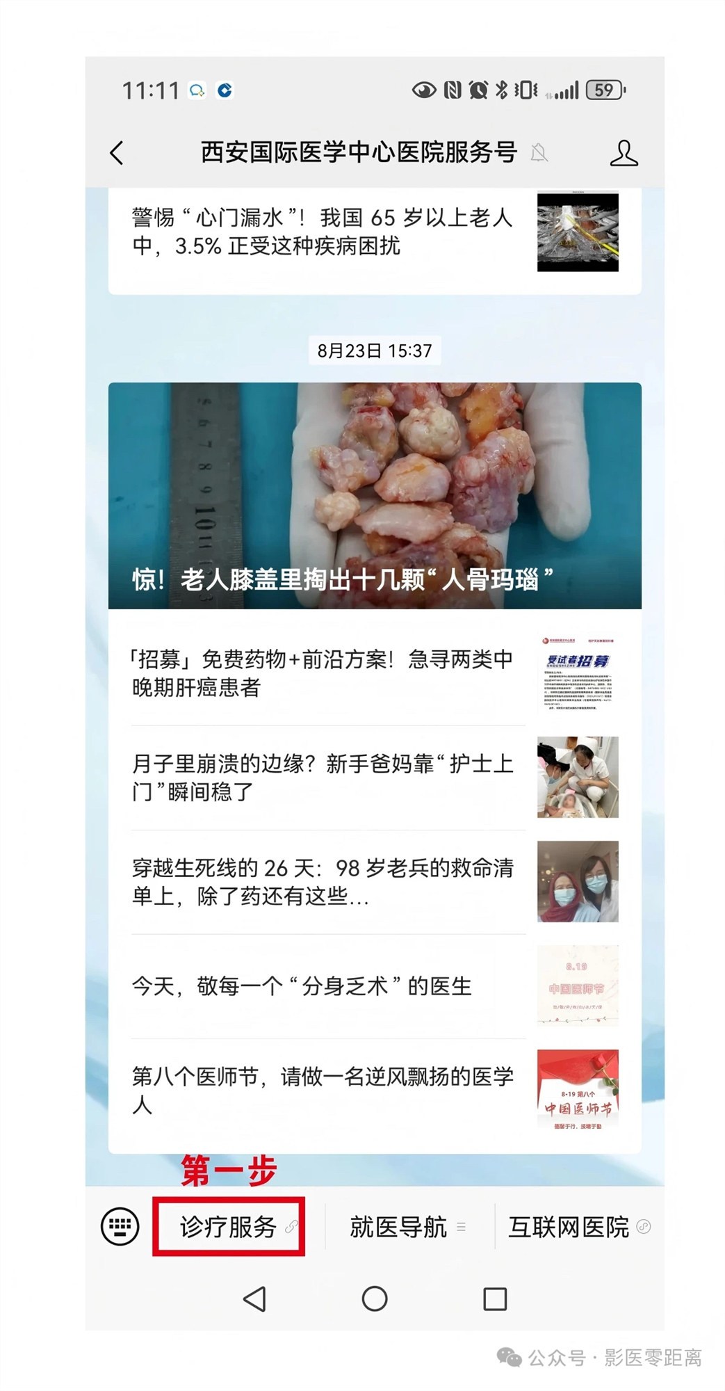 第一步:在醫(yī)院微信公眾號首頁,點擊底部菜單欄左側(cè)的【診療服務】入口